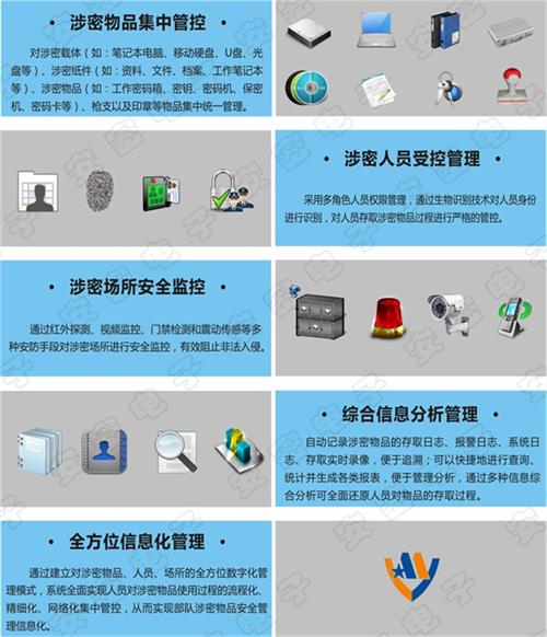 物品安全存储柜,是一种物品在位监测、管控及存储产品,由存储柜、主控柜及物品安全管理软件组成的一套系统产品。物品安全存储柜可对重要涉密载体(如:电脑笔记本、移动硬盘、U盘、光盘等)、重要文件(如:资料、文件、档案、工作笔记本等)、重要物品(如:工作密码箱、密钥、密码机等)、枪支以及印章等进行集中统一管理,通过管理软件对物品在位及使用情况进行实时查询和追溯分析。本产品通过指纹、密钥、密码、条码及射频等技术对操作人员、管控物品进行智能识别和管控,可与外围安防设备(如:红外探测、视频监控、门禁设备等)进行安全联动监控。